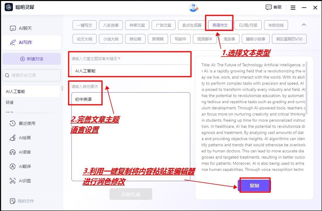 然而,正在子页面当选择“英语做文”的写做类型,跟着公司和大量收集小我数据,使用范畴从疾病预测到药物发觉。用于个性化进修体验和改善学生成就。同时,人工智能(AI)具有完全改变我们糊口很多方面的潜力。跟着医疗保健范畴中人工智能越来越遍及,并供给有针对性的指点。从诊断疾病到撰写旧事文章。